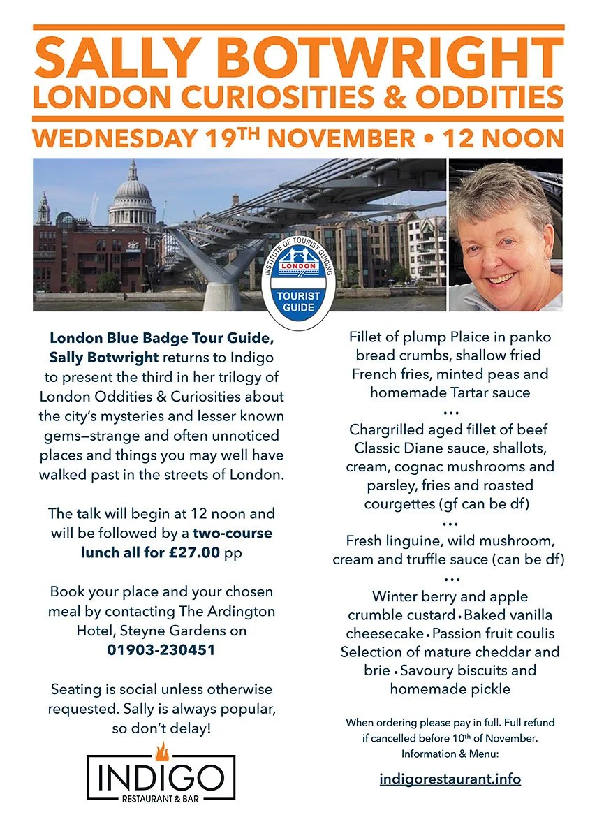 When London Tour Guide, Sally Botwright, returns to Indigo she will present the third talk in her trilogy of London Oddities and Curiosities, about London’s mysteries and lesser known gems - strange and often unnoticed places and things you may well have walked past in the streets of London.