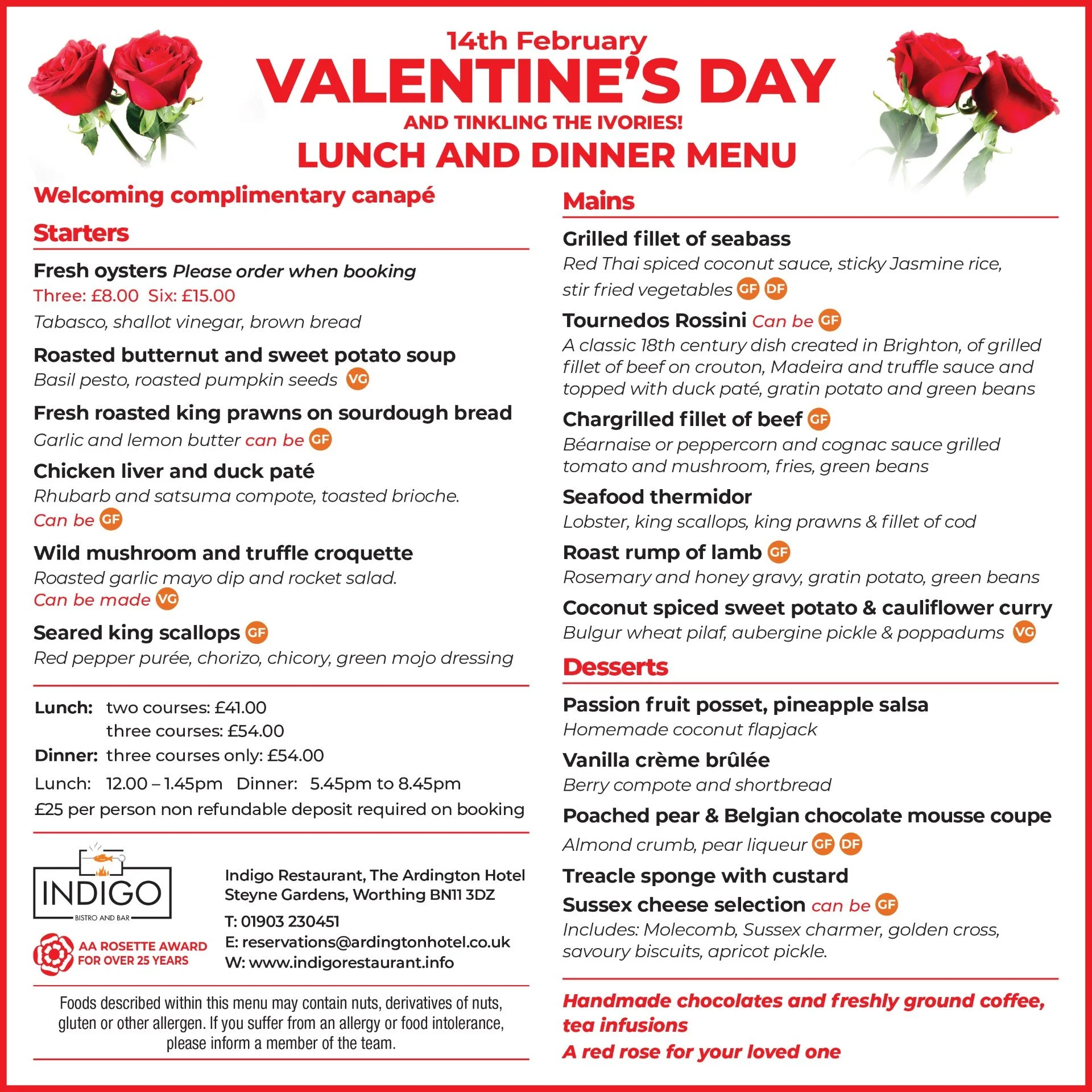 Enjoy a complementary welcome canapé and Indulge in 2 or 3 courses at lunch or 3 courses for dinner. Relax in the company of your loved one as our pianist tinkles the ivories. Choose something from our extensive bar offering and let our wonderful team serve up a delicious meal finished with homemade chocolates, freshly ground coffee or tea infusions and a rose for your loved one.
