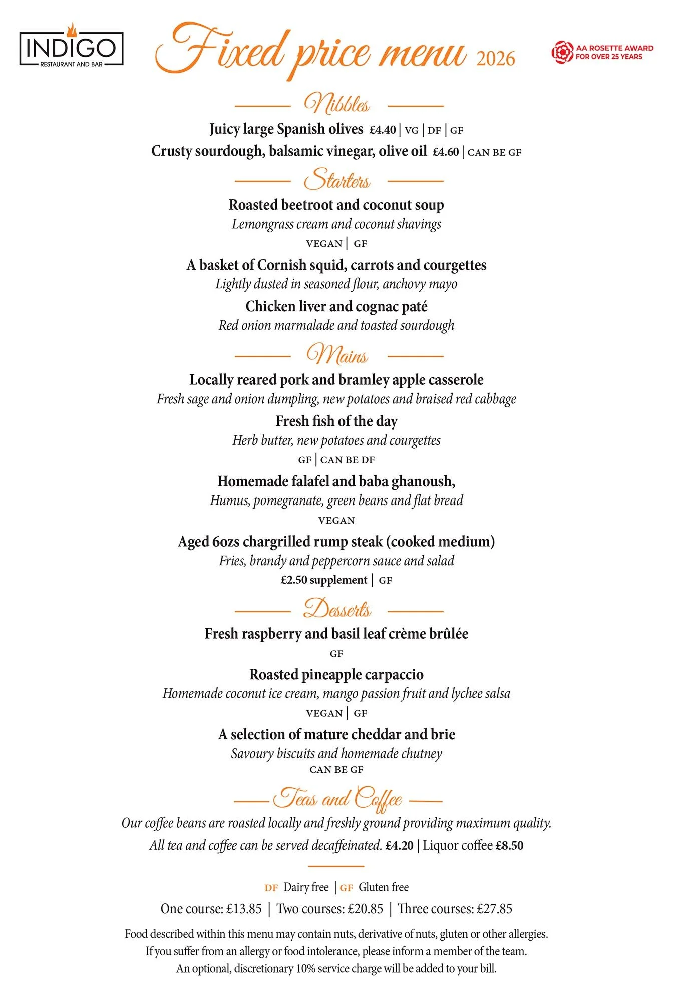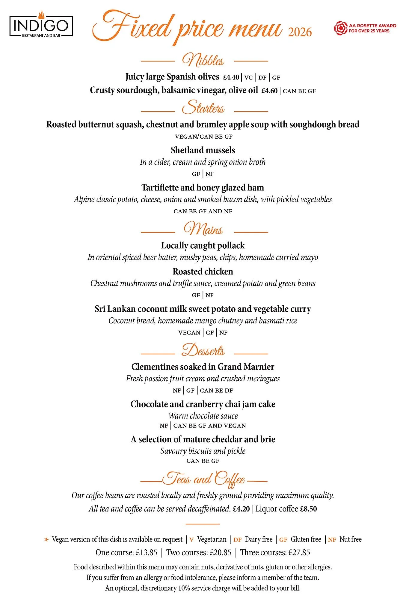 Foods described within this menu may contain nuts, derivatives of nuts, gluten or other allergen. If you suffer from an allergy or food intolerance, please inform a member of the team.